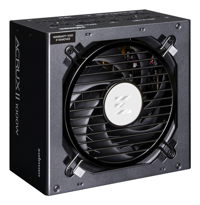Zalman ACRUX II. Potencia total: 1000 W, Voltaje de entrada AC: 100 - 240 V, Frecuencia de entrada AC: 50/60 Hz. Alimentador de energ?a para tarjeta madre: 24-pin ATX, Longitud del cable de alimentaci?n de la placa base: 60 cm, Longitud del cable de alimentaci?n SATA: 500 mm. Utilizar con: PC, Factor de forma de fuente de alimentaci?n (PSU): ATX, Certificaci?n 80 PLUS: 80 PLUS Platinum. Color del producto: Negro, Di?metro de ventilador: 12 cm. Certificados de conformidad: CE, CB, RoHS, EAC, cTUVus, RCM, Comisi?n Federal de Comunicaciones (FCC) de Estados Unidos, Certificaci?n: LAMBDA A+, Cybenetics ETA TITANIUM