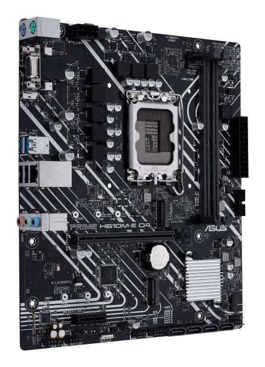 ASUS PRIME H610M-E D4-CSM. Fabricante de procesador: Intel, Socket de procesador: LGA 1700, Procesador compatible: Intel? Celeron?, Intel? Core? i3, Intel? Core? i5, Intel? Core? i7, Intel? Core? i9, Intel? Pentium?. tipos de memoria compatibles: DDR4-SDRAM, Memoria interna m?xima: 64 GB, Tipo de ranuras de memoria: DIMM. Tipo de interfaz ethernet: Gigabit Ethernet. Componente para: PC, Factor de forma: micro ATX, Familia del chipset: Intel. Ancho: 244 mm, Profundidad: 211 mm, Altura: 221 mm