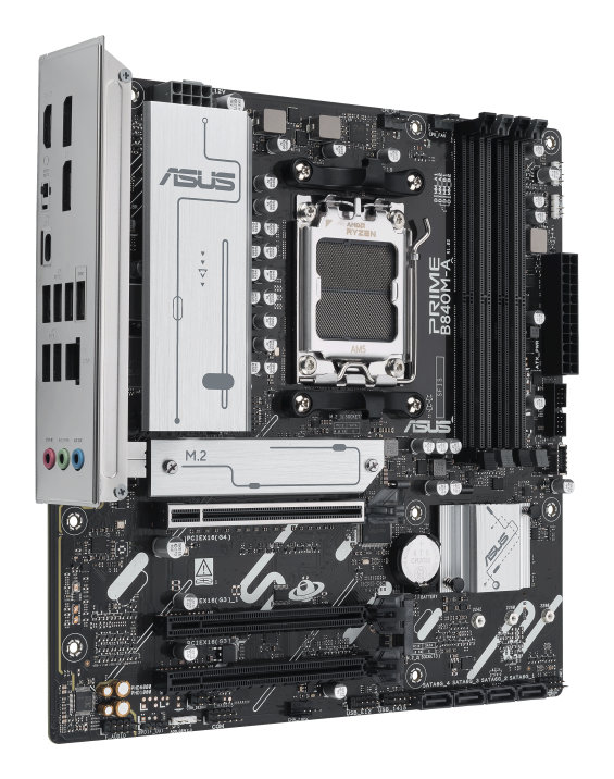 ASUS PRIME B840M-A-CSM. Fabricante de procesador: AMD, Socket de procesador: Z?calo AM5, Procesador compatible: AMD Ryzen 7000 Series, AMD Ryzen 8000 Series, AMD Ryzen 9000 Series. tipos de memoria compatibles: DDR5-SDRAM, Memoria interna m?xima: 192 GB, Tipo de ranuras de memoria: DIMM. Interfaces de disco de almacenamiento soportados: M.2, SATA III, Tipos de unidades de almacenamiento admitidas: HDD & SSD, Niveles RAID: 0, 1, 5, 10. M?xima resoluci?n: 7680 x 4320 Pixeles. Tipo de interfaz ethernet: 2.5 Gigabit Ethernet