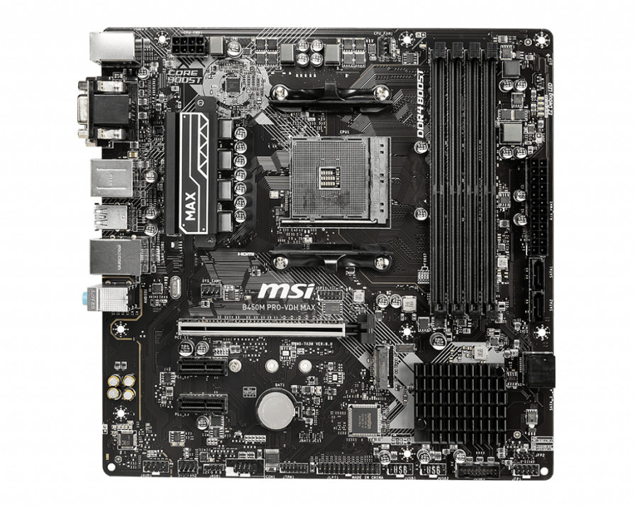 MSI B450M PRO-VDH Max. Fabricante de procesador: AMD, Socket de procesador: Z?calo AM4, Procesador compatible: AMD Athlon, AMD Ryzen 2000 Series, AMD Ryzen 3000 Series. tipos de memoria compatibles: DDR4-SDRAM, Memoria interna m?xima: 64 GB, Tipo de ranuras de memoria: DIMM. Interfaces de disco de almacenamiento soportados: SATA III, Niveles RAID: 0, 1, 10. Tipo de interfaz ethernet: Gigabit Ethernet, Controlador LAN: Realtek 8111H. Componente para: PC, Factor de forma: micro ATX, Familia del chipset: AMD