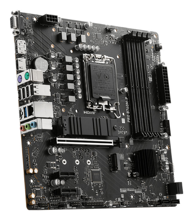 MSI PRO B760M-P. Fabricante de procesador: Intel, Socket de procesador: LGA 1700, Procesador compatible: Intel? Celeron?, Intel? Pentium? Gold. tipos de memoria compatibles: DDR5-SDRAM, Memoria interna m?xima: 192 GB, Compatibilidad de ECC: No-ECC. Interfaces de disco de almacenamiento soportados: SATA III, Tipos de unidades de almacenamiento admitidas: HDD & SSD, Niveles RAID: 0, 1, 5, 10. Tipo de interfaz ethernet: Gigabit Ethernet, Controlador LAN: Realtek RTL8111H. Componente para: PC, Factor de forma: micro ATX, Familia del chipset: Intel