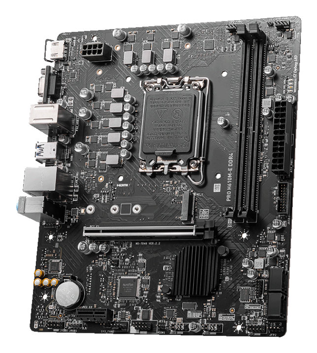 MSI PRO H610M-E DDR4. Fabricante de procesador: Intel, Socket de procesador: LGA 1700, Procesador compatible: Intel? Core? i9. tipos de memoria compatibles: DDR4-SDRAM, Memoria interna m?xima: 64 GB, Tipo de ranuras de memoria: DIMM. Interfaces de disco de almacenamiento soportados: M.2, SATA III, Tipos de unidades de almacenamiento admitidas: HDD & SSD. Tipo de interfaz ethernet: Gigabit Ethernet. Componente para: PC, Factor de forma: micro ATX, Familia del chipset: Intel