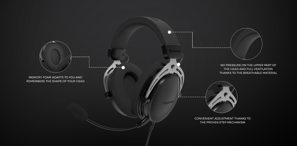 Los Genesis Toron 531 tienen un dise?o cerrado alrededor de la oreja que te a?sla eficazmente de los ruidos exteriores. Menos ruido no deseado = m?s concentraci?n en tu juego, y no se detiene ah?. El material transpirable y suave del interior de la diadema garantizar? una temperatura ?ptima y minimizar? el riesgo de sudoraci?n. No se quedan atr?s las c?modas almohadillas de espuma con memoria, similares al cuero, con una capa superior textil: no s?lo se ajustan al usuario y recuerdan la forma de la cabeza, sino que combinan las mejores caracter?sticas de las almohadillas de cuero (atenuaci?n del sonido) y las de tela (m?xima comodidad en contacto con la piel). Tambi?n encontrar?s un juego extra de almohadillas totalmente textiles para darte apoyo en los d?as calurosos. A?ade a esto un ajuste de anchura escalonado y cero compresi?n de ning?n tipo. ?Necesitas algo m?s?