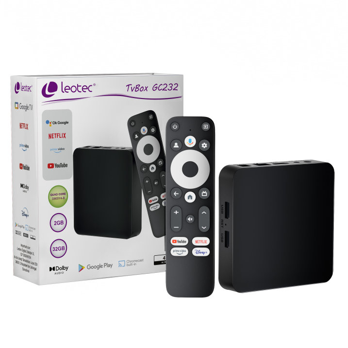Leotec LETVBOXGC06. Fabricante de procesador: Amlogic, Modelo del procesador: S905Y4, Arquitectura del procesador: Cortex-A35. Memoria interna: 2 MB, Tipo de memoria interna: LPDDR4. Capacidad de almacenamiento interno: 32 GB, Tipo de almacenamiento: eMMC. Adaptador gr?fico: Mali G31-MP2. Sistema operativo instalado: Android, Apoyar a las aplicaciones de Google: Google Cast, Google Chromecast, Google Play, YouTube