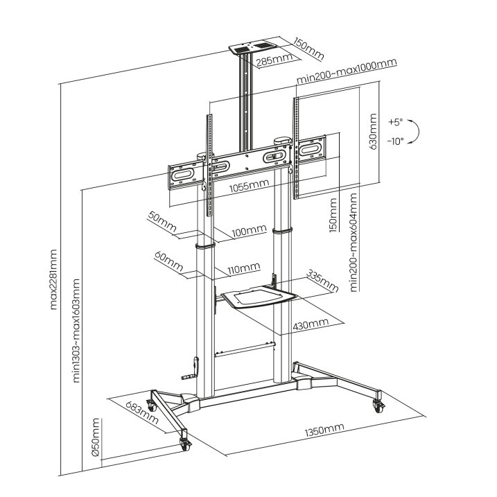 AISENS Soporte de Suelo ECO con Ruedas y Manivela, Bandeja para DVD y Soporte de C?mara para Monitor/TV 100Kg de 60-100, Negro, 100 kg, 152,4 cm (60"), 2,54 m (100"), 200 x 200 mm, 1000 x 600 mm, 1335 - 1635 mm