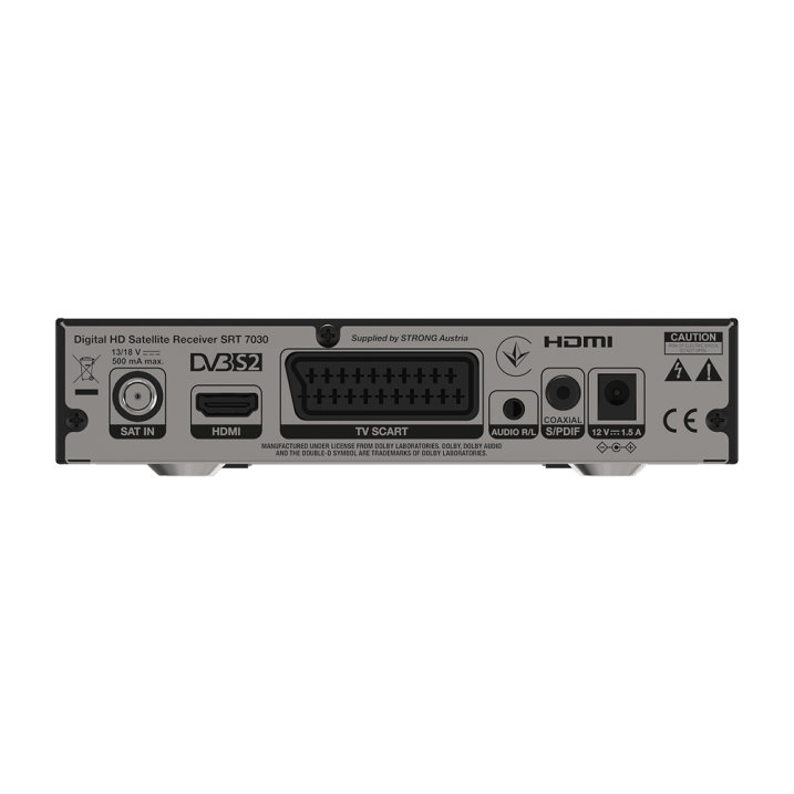 Strong SRT 7030. Fuente de se?al: Sat?lite, Tipo HD: HD, Formato de se?al digital: DVB-S, DVB-S2. Formatos de v?deo compatibles: H.264, MPEG4, Formatos de compresi?n de video: MPEG4, H.264, Formatos de audio soportados: EAC3, MPEG-1, MPEG-2. Memoria interna: 64 MB, Memoria Flash: 8 MB. Color del producto: Negro, Tipo de sintonizador: Digital, N?mero de sintonizadores: 1 sintonizador(es). Modelo del procesador: Ali M3510G