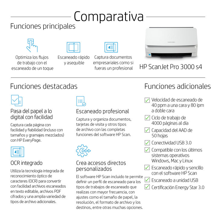 | Contenidos de caja | HP ScanJet Pro 3000 s4 con alimentador de hojas; Cable de alimentaci?n; Adaptador de alimentaci?n; Cable USB; Motor del esc?ner; Folletos; Gu?a de instalaci?n |