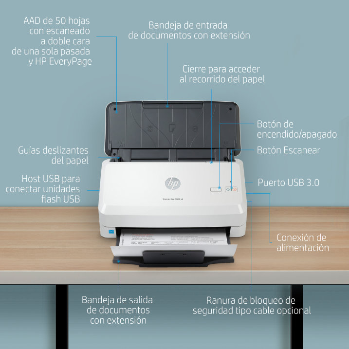 | Software incluido | Windows: Controlador de escaneado HP WIA, controlador de escaneado HP TWAIN (32 bits y 64 bits), HP Scan, HP Scanner Tools Utility y OpenText ISIS |