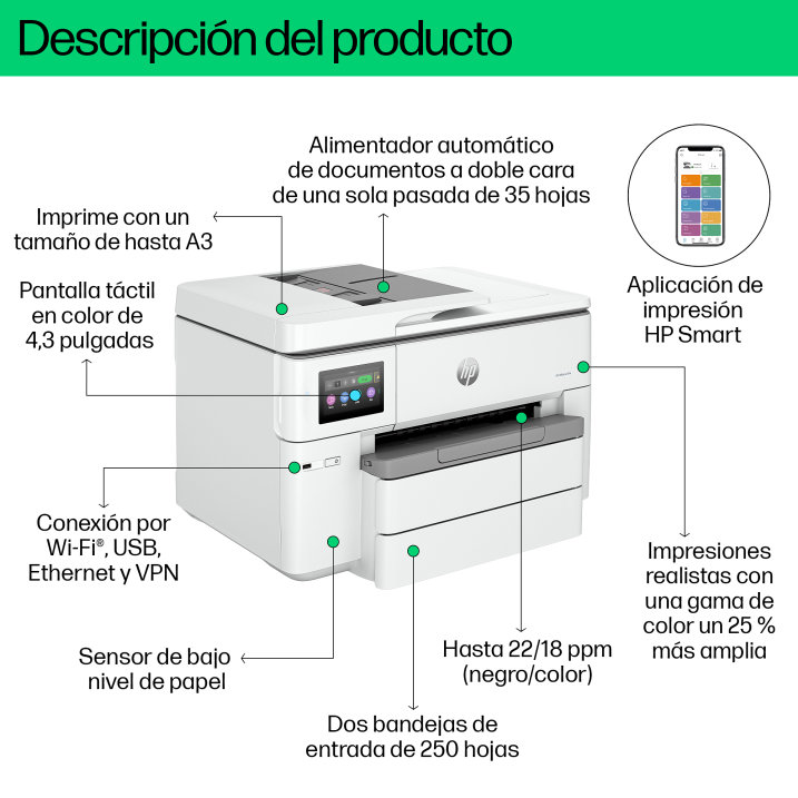 Imprime y escanea en formato ancho como un profesional. Dale la bienvenida a la impresora profesional de inyecci?n de tinta a color de formato ancho para el crecimiento de tu negocio de la empresa de impresoras n.? 1 del mundo, en combinaci?n con la aplicaci?n de impresi?n m?s f?cil de usar. Imprime y escanea en tama?os de hasta A3 con funciones de rendimiento adicionales.[1,2]. Apto para HP Instant Ink