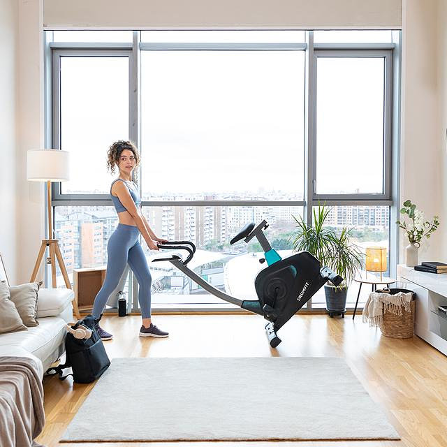 Sillín regulable, ergonómico y acolchado, con un cómodo manillar para tus entrenamientos de largo recorrido.