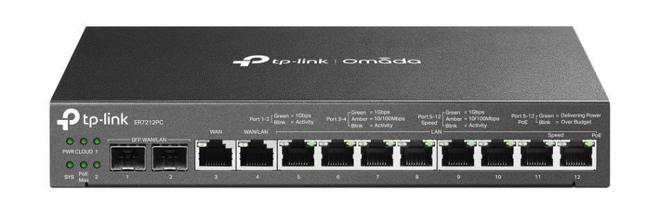 TP-Link Omada ER7212PC. Est?ndares de red: IEEE 802.1Q, IEEE 802.3, IEEE 802.3ab, IEEE 802.3u, IEEE 802.3x, IEEE 802.3z, Tipo de interfaz ethernet: Gigabit Ethernet, Tecnolog?a de cableado: 10/100/1000Base-T(X). Protocolos soportados: TCP/IP, DHCP, ICMP, NAT, PPPoE, NTP, HTTP, HTTPS, DNS, IPSec, PPTP, L2TP, SNMP. NAT, funcionalidad: Multi-Net NAT; Virtual Server; NAT-DMZ; FTP/H.323/SIP/IPSec/PPTP ALG; UPnP;. Frecuencia del procesador: 1200 MHz, Memoria Flash: 4096 MB, Memoria interna: 1024 MB. Color del producto: Negro, Material de la carcasa: Metal