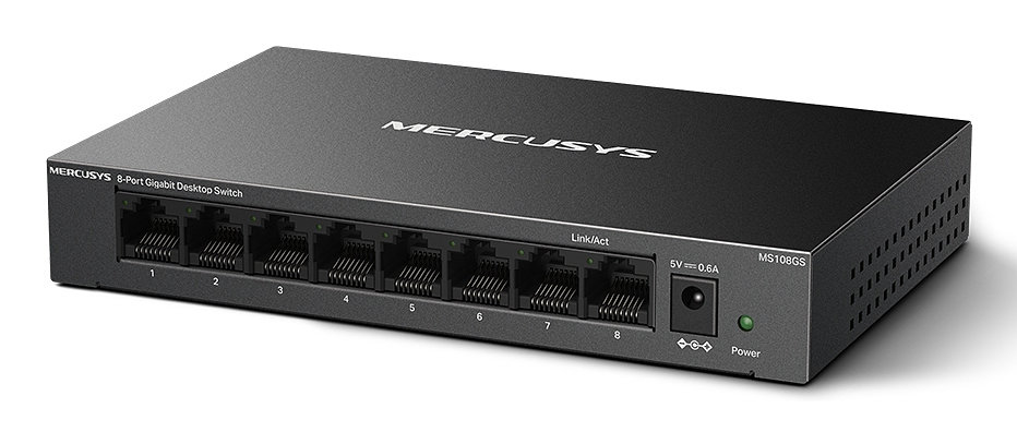 Mercusys MS108GS. Tipo de interruptor: No administrado. Puertos tipo b?sico de conmutaci?n RJ-45 Ethernet: Gigabit Ethernet (10/100/1000), Cantidad de puertos b?sicos de conmutaci?n RJ-45 Ethernet: 8. Bidireccional completo (Full duplex). Tabla de direcciones MAC: 8000 entradas, Capacidad de conmutaci?n: 16 Gbit/s. Est?ndares de red: IEEE 802.3, IEEE 802.3ab, IEEE 802.3i, IEEE 802.3p, IEEE 802.3u, IEEE 802.3x. Voltaje de entrada DC: 5 V. Conector el?ctrico: Toma de entrada de CC. Montaje de pared