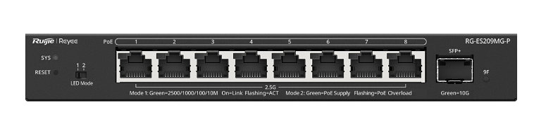 Ruijie Networks RG-ES209MG-P. Tipo de interruptor: Gestionado, Capa del interruptor: L2. Puertos tipo b?sico de conmutaci?n RJ-45 Ethernet: 2.5G Ethernet (100/1000/2500), Cantidad de puertos b?sicos de conmutaci?n RJ-45 Ethernet: 8. Tabla de direcciones MAC: 4000 entradas, Capacidad de conmutaci?n: 60 Gbit/s. Est?ndares de red: IEEE 802.3af, IEEE 802.3at. Voltaje de entrada DC: 54 V. Energ?a sobre Ethernet (PoE). Montaje de pared