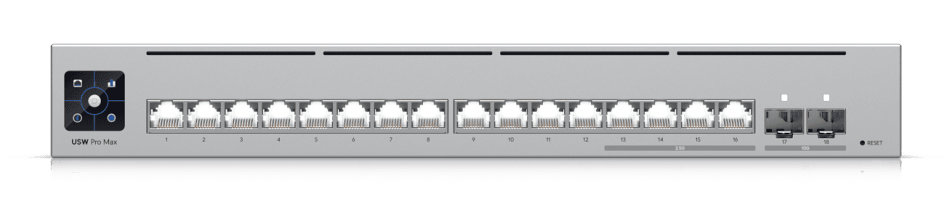 Ubiquiti Pro Max 16. Capa del interruptor: L3. Puertos tipo b?sico de conmutaci?n RJ-45 Ethernet: 2.5G Ethernet (100/1000/2500), Cantidad de puertos b?sicos de conmutaci?n RJ-45 Ethernet: 16. Tabla de direcciones MAC: 16000 entradas, Capacidad de conmutaci?n: 84 Gbit/s. Est?ndares de red: IEEE 802.1x. Conector el?ctrico: AC/DC. Montaje en rack, Factor de forma: 1U