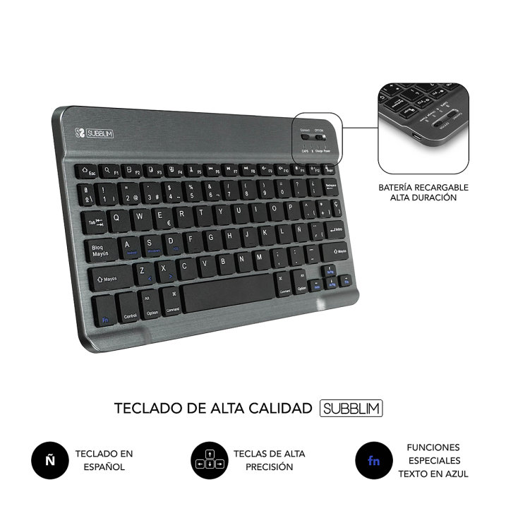 SUBBLIM Teclado Retroiluminado Bluetooth Smart Backlit BT Keyboard Grey, QWERTY, Espa?ol, 5 mill?n de caracteres, Cualquier marca, Compatible con todos los dispositivos con conexi?n Bluetooth como Tablets, Ordenadores,..., Negro, Gris